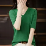 Be the first to review “2025 Women Sweater Short Sleeve Spring Summer Knitwears Korean Fashion Stripe Pullovers Slim Fit Knit Tops Casual V-neck Jumpers” Cancel reply