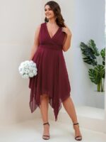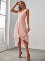 A super-stylish midi asymmetrical hems bridesmaid dress is hard to resist especially when it has a ruched bodice and belt harmonized beautifully with each other. This double V-neck midi asymmetrical hems bridesmaid dress will shift your look beyond versatile. Go for this adorable short bridesmaid dress and make ever-lasting impression on the guests at any event.