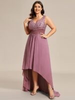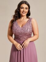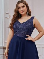 Hold your hearts because this stunning evening dress would make you look like a princess. This plus size evening dress for mature woman features a deep V-neck and is sleeveless. The A-line silhouette of the dress makes it look high-end and fabulous. The paillette designing on the upper body looks stunning as well. This gorgeous dress is perfect for all formal occasions, from evening party, cocktail, weddings to prom, homecoming and graduation!