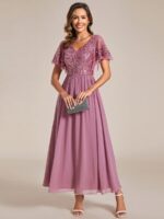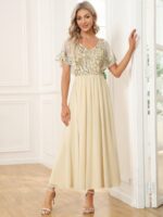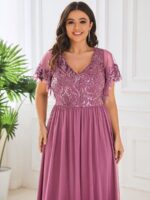 This vintage-influenced mother of the bride dress features a classic A-line silhouette. A cinched waist complements the gorgeous sequin pattern on the top with sheer, draped sleeves and a plunging v-neck and v-back. An ankle-length tulle bottom finishes the look, giving it effortless elegance.