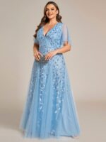 This plus size shimmery maxi long evening gown for weddings features a double deep V neckline and ruffles sleeves. The shimmery leave design gives a romantic vibe. No matter what occasion,?this long formal evening dress with sleeves will make you look gorgeous and elegant. Suitable for evening party, cocktail, weddings, prom, homecoming and graduation!Prices will vary as certain colors of this style is on sale.