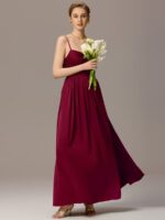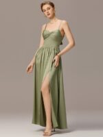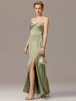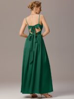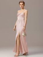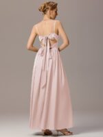 Step into elegance with this satin maxi bridesmaid dress, featuring a beautifully pleated design that enhances its graceful flow. The backless silhouette adds a touch of allure, while the sleeveless cut keeps it sleek and modern. Perfect for weddings and special occasions, this dress offers timeless sophistication with a flattering fit.