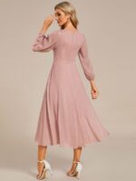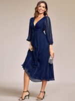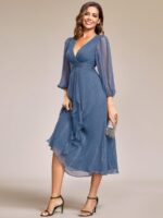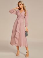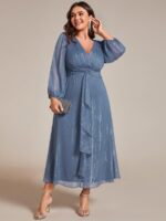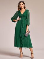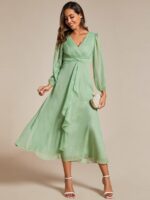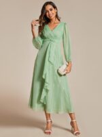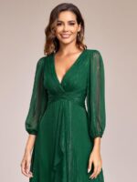 Make a stunning entrance at your next evening affair with this See-Through Long Sleeve Twist Knot A-Line Lotus Leaf Shimmering Evening Dress. The sheer long sleeves give a touch of sophistication, while the twist knot at the waist accentuates your curves in the most flattering way. The lotus leaf shimmering design adds a luxurious and glamorous touch, making this dress perfect for formal events, red carpet galas, or even a romantic dinner date.
