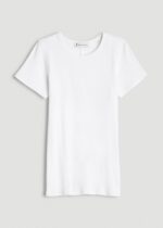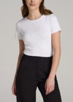 Our Short Sleeve Crew Neck Ribbed T-Shirt for tall women is a wardrobe essential for ladies over 5’9″. With a focus on a snug fit and simple style, this top for tall women is designed to cater to your unique proportions and goes with nearly any outfit. It’s more than just an average tee; it’s a staple piece of clothing you’ll wear again and again.