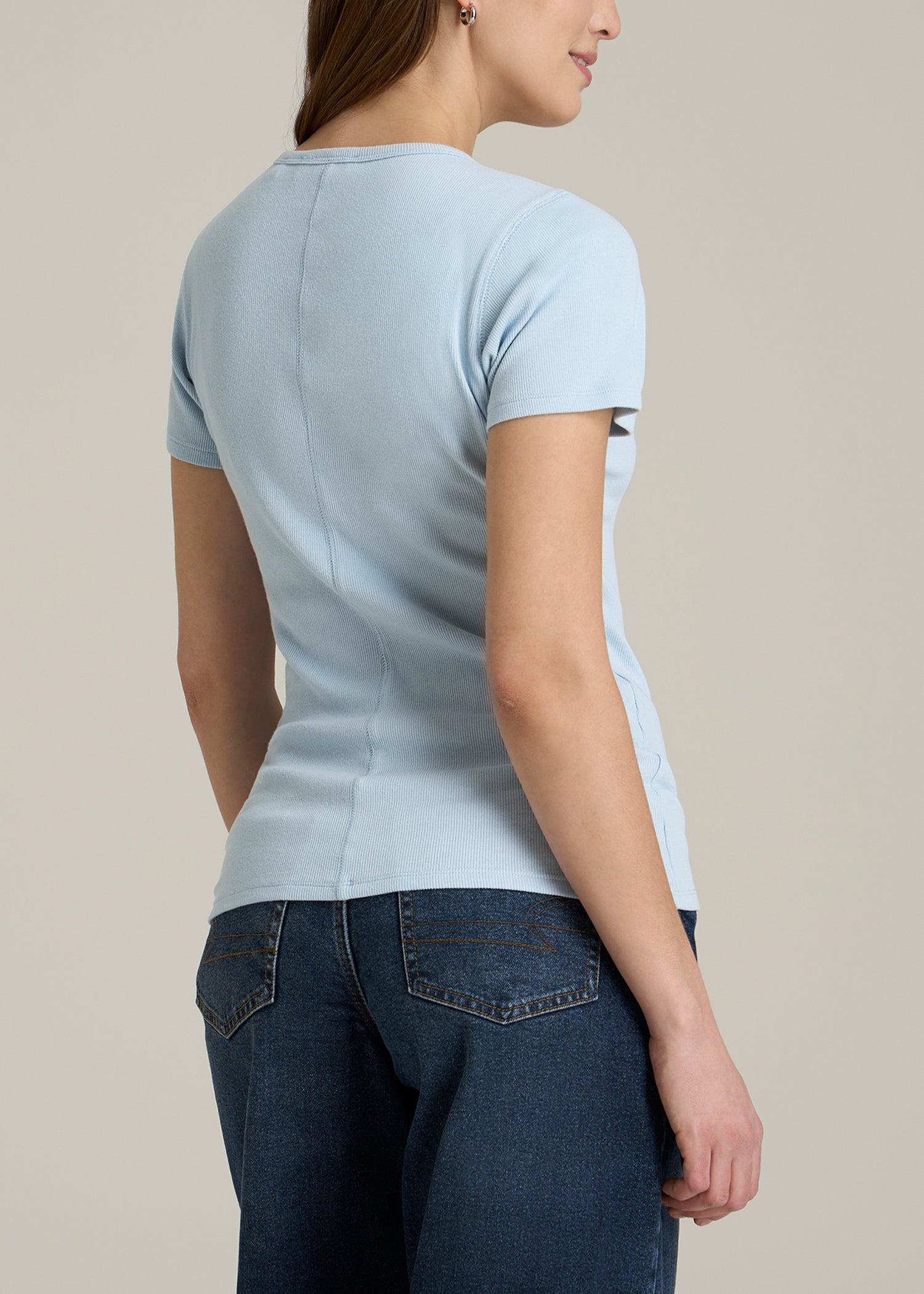 Our Short Sleeve Crew Neck Ribbed T-Shirt for tall women is a wardrobe essential for ladies over 5’9″. With a focus on a snug fit and simple style, this top for tall women is designed to cater to your unique proportions and goes with nearly any outfit. It’s more than just an average tee; it’s a staple piece of clothing you’ll wear again and again.