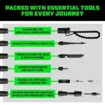 • 14 Essential Tools – Includes 3-mode flashlight, fire starter, glass-breaker pen, and more