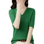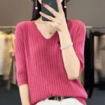 Be the first to review “Women Sweater Short Sleeve V-neck Stripe Knitwears Slim Fit Shirt Korean Fashion Pullovers Thin Knit Tops 2025 Bottoming Shirts” Cancel reply