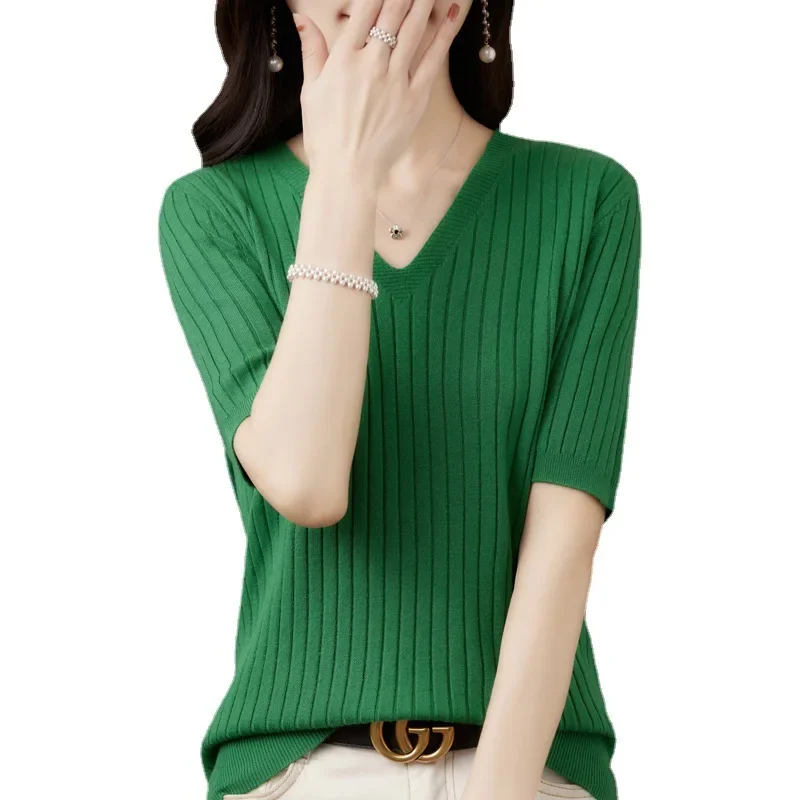 Women Sweater Short Sleeve V-neck Stripe Knitwears Slim Fit Shirt Korean Fashion Pullovers Thin Knit Tops 2025 Bottoming Shirts