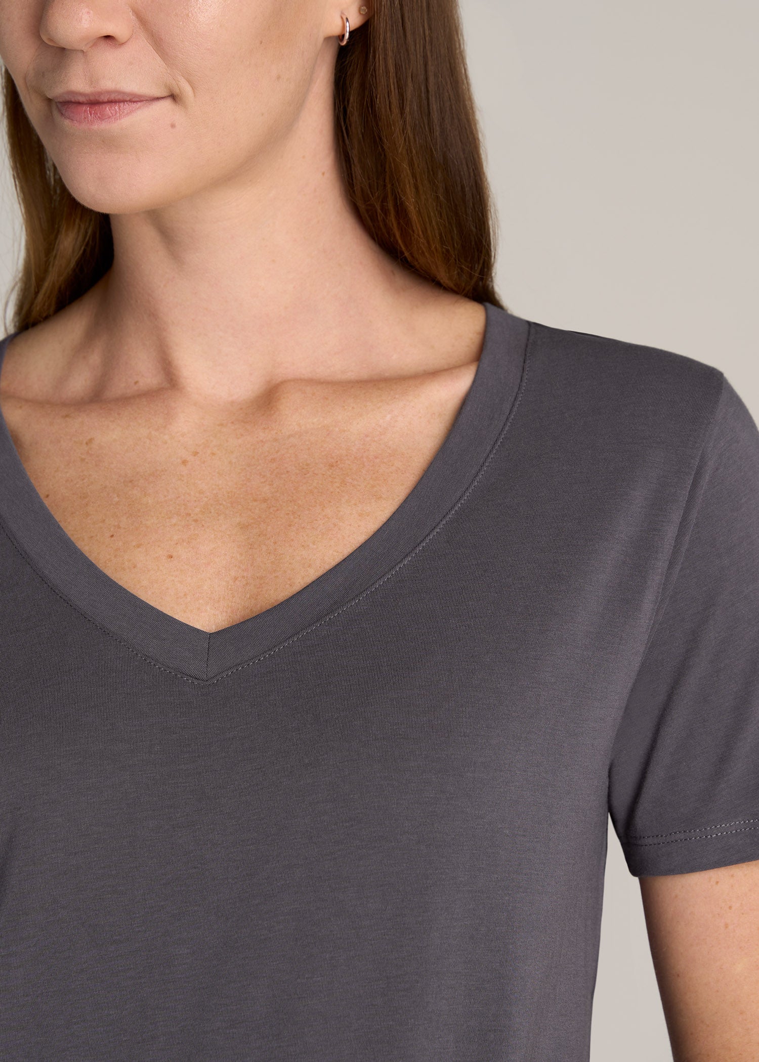 More than just a regular tee. This women’s tall V-neck t-shirt has been specially designed just for you and is an everyday basic you’ll want to wear year-round. Having wardrobe staples that fit perfectly is a luxury that most tall women don’t have, which is why we exclusively design all our shirts for tall women between 5’9” and 6’6”. The rounded hem will end well below your hips where it’s supposed to and the scoop V neckline is ultra-flattering on any shape. This tee has a relaxed fit that will drape your frame beautifully and hug your curves in all the right places so you can leave the days of baggy tops behind. It’s a must-have for every tall woman’s wardrobe that you can wear with just about anything, from jeans to leggings, and will quickly become your go-to tee.
